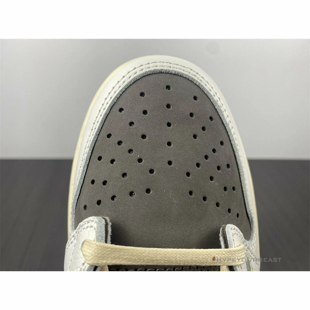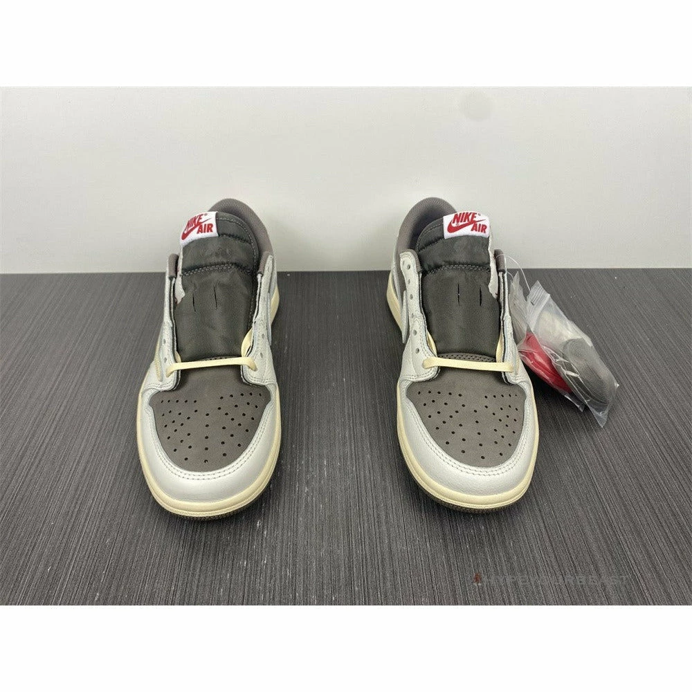 Air Jordan 1 Low X Travis Scott Grey The shoe features a dark gray leather upper with white leather overlays and a beige Nike Swoosh. These sneakers even highlight its stylish dark gray, white beige combination along its upper. Air Jordan 1 Low X Travis Scott Grey is also a low-top pair that brings out beige midsoles and dark gray rubber outsoles.