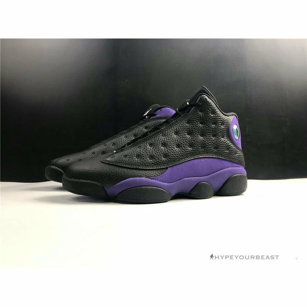 Air Jordan 13 Purple Black white belongs to the Rivals series of 2019, but still maintains its dashing look on your feet. The sneakers Black and Purple Air Jordan 13 presents black perforated leather upper with Lakers colorways on its accents. Air Jordan 13 Purple and Black highlights the purple hints on the mudguard and heel tabs. The outsoles also flash black and white hues with the Jumpman logo on the herringbone pods. You can enjoy the fascinating look and style of this footwear during casual or athletic events, especially if you choose to wear it with light and neutral-colored outfits.