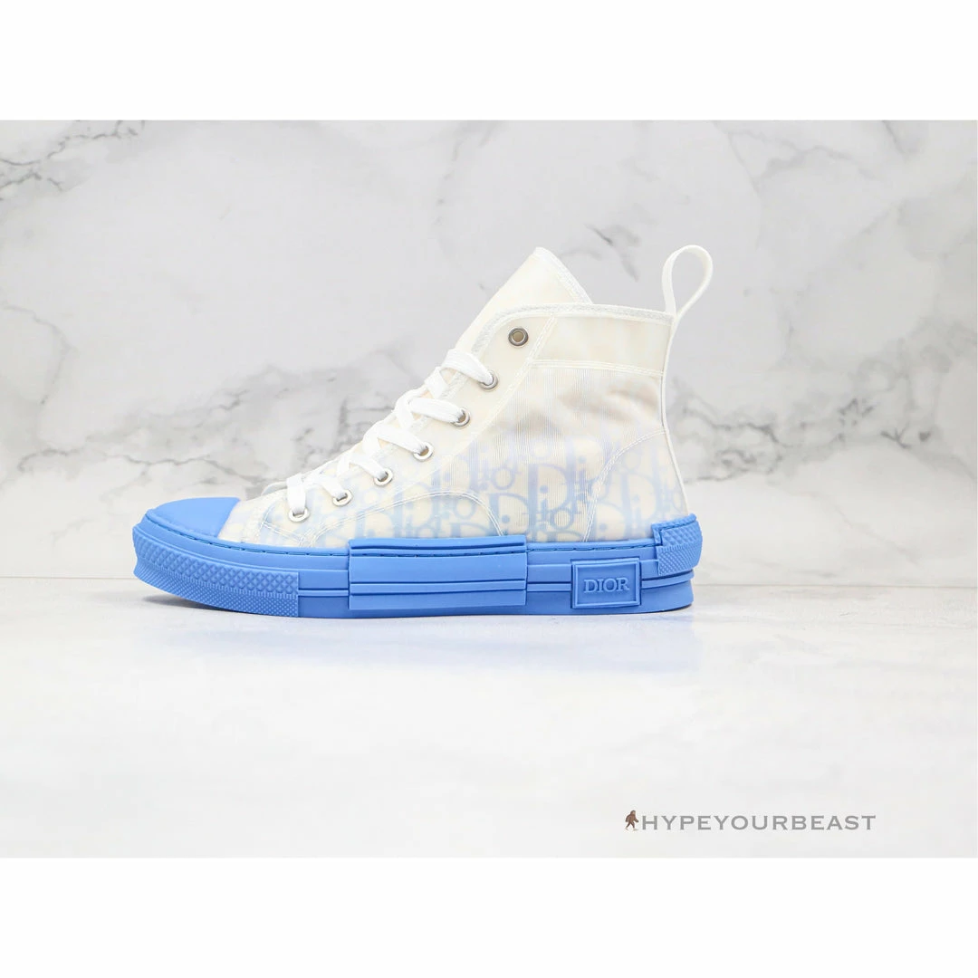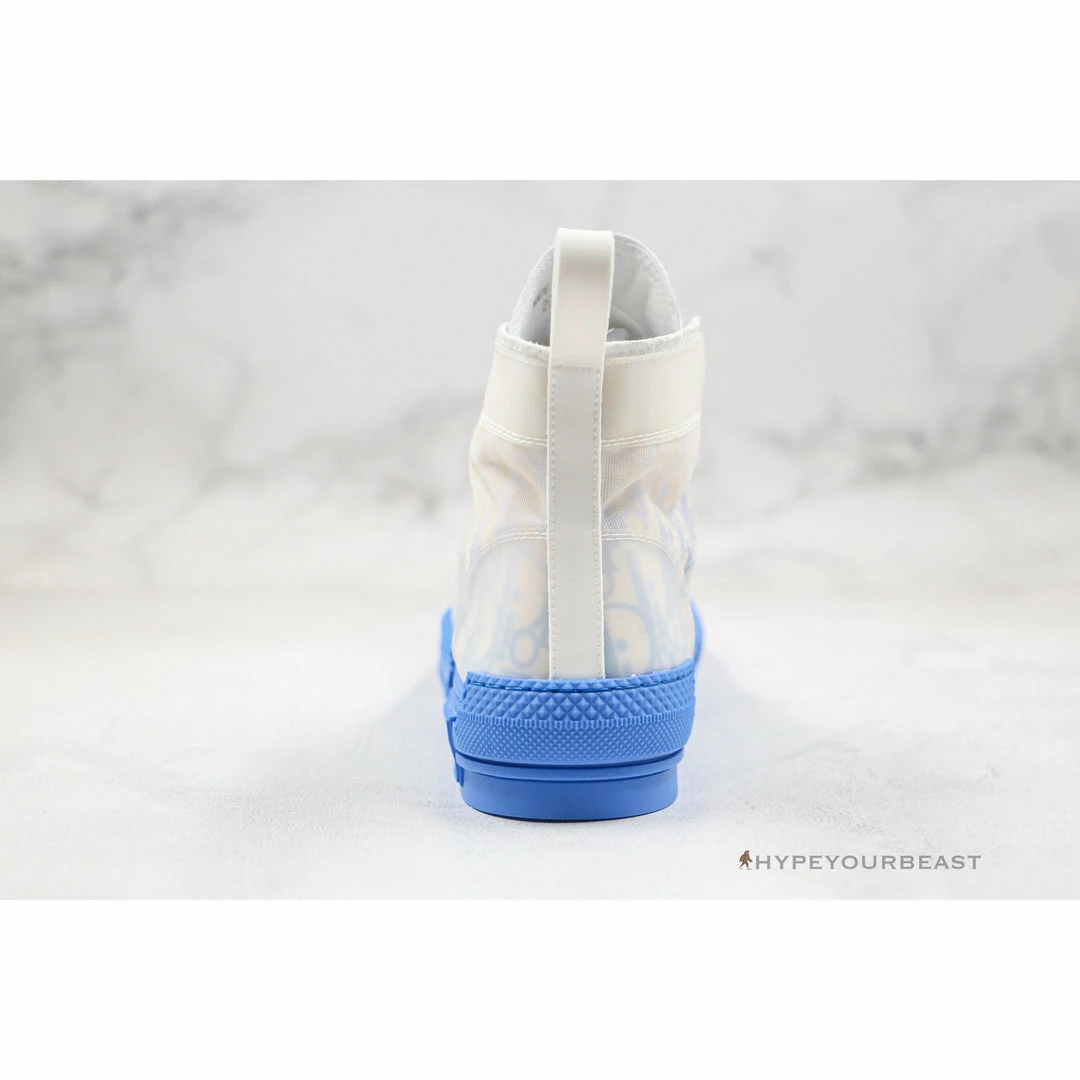 Two-tone blue and white sneakers with gradient effect is the main feature of Dior B23 High Top Gradient Blue. The upper of the sneakers showcase the clean white Dior Oblique Canvas with translucent overlay, while its soles give the pure blue tone hue. Most importantly, this blue hue reveals a gradient effect just above the soles which gives another style to the pair. Thus, as you walk with these Dior B23 High Top Gradient Blue sneakers, you will surely be the next center of attraction.